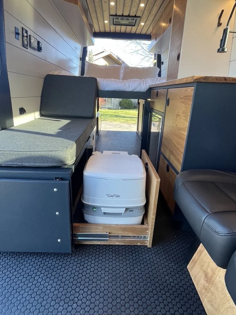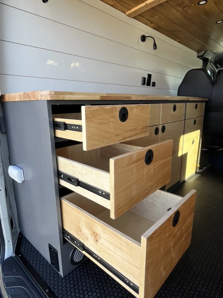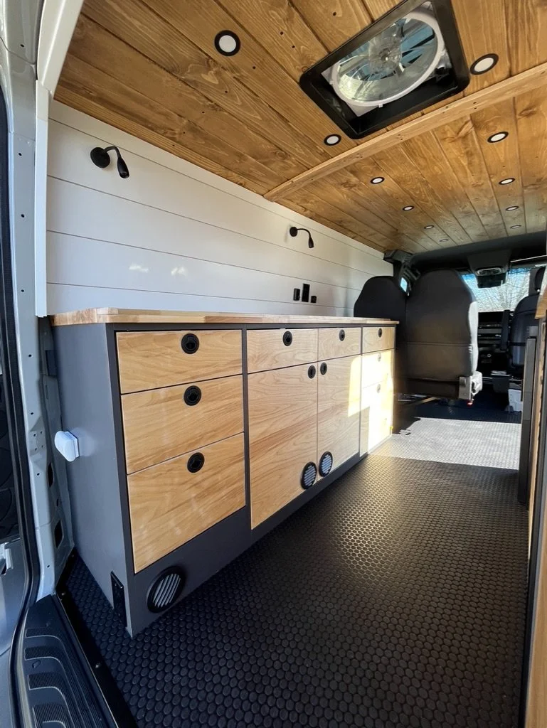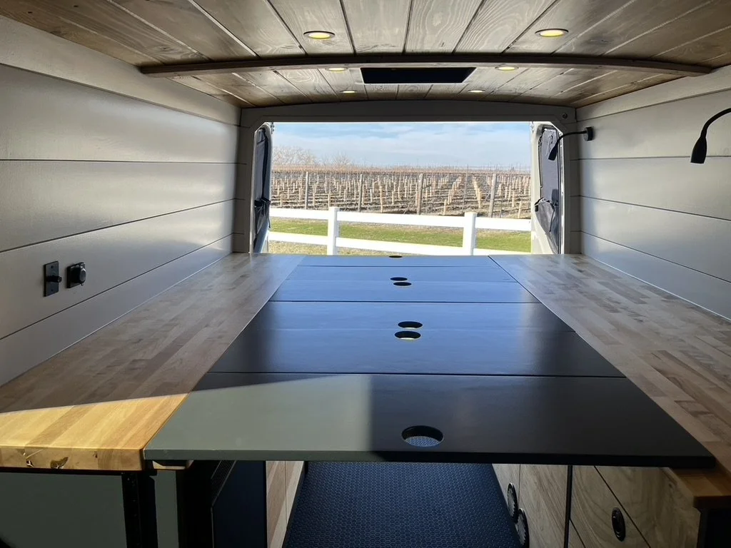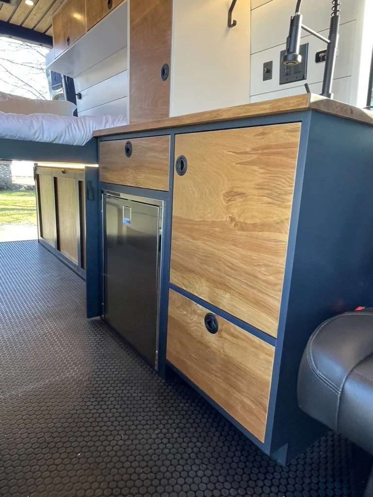 Nothing Ventured might be new to the van conversion scene, but we bring skillful woodworking, creative design practices, and real-world van life experiences to each van we build. Our first build was designed to balance comfort and adventure. The build features a robust 300Ah electrical system, a convertible dinette to bed, a galley style kitchen, a full shower, and many more practical features and creature comforts.