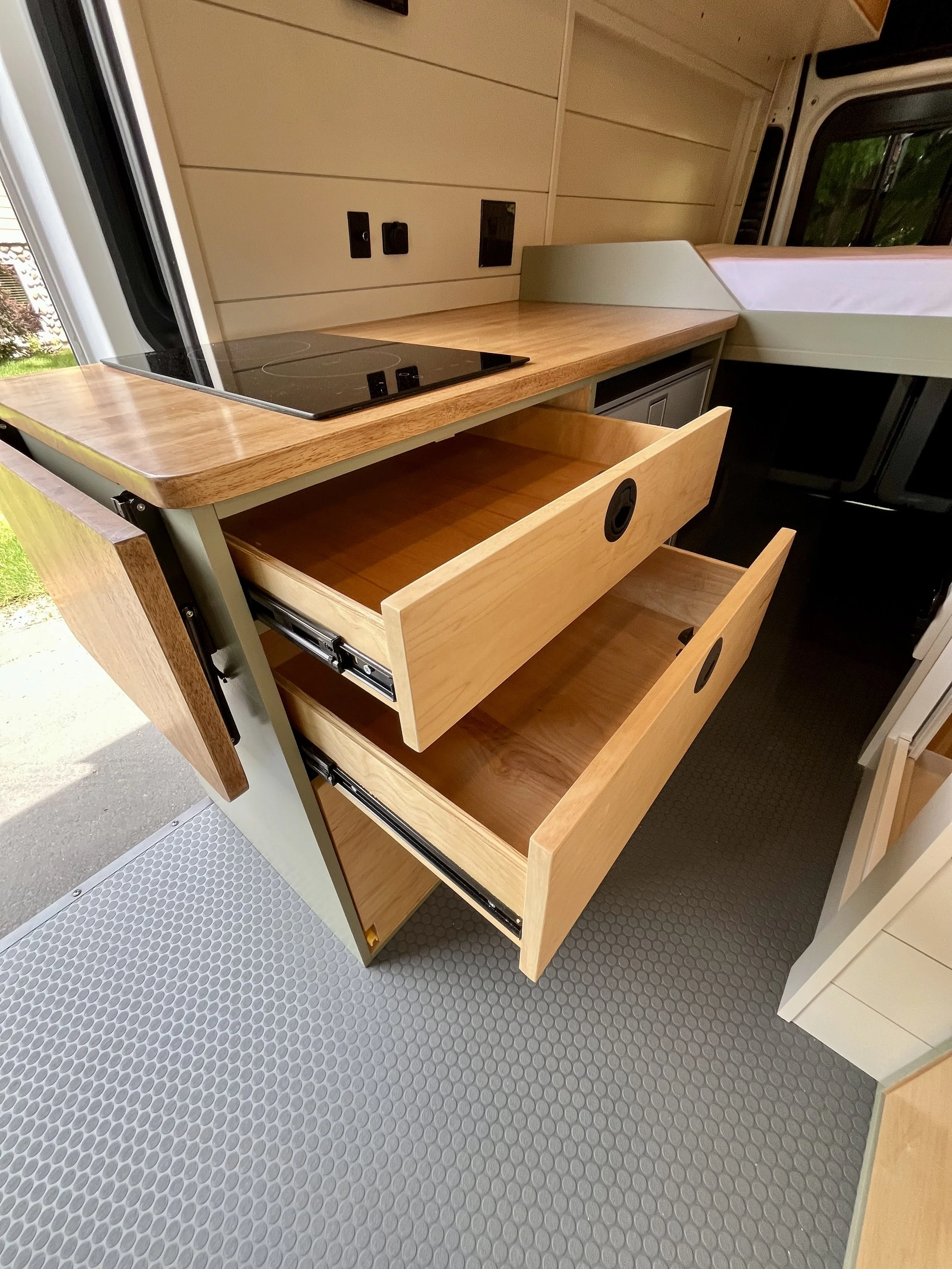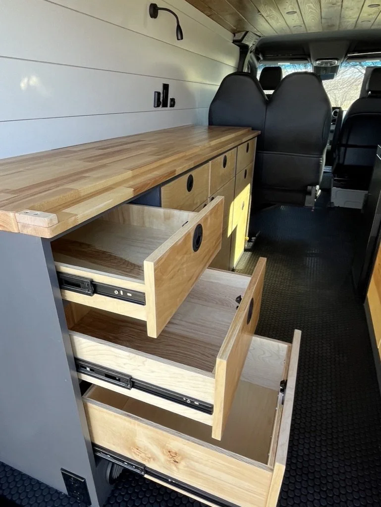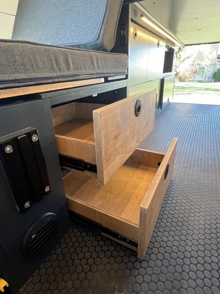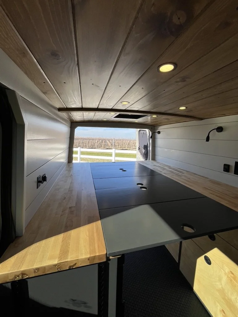 Nothing Ventured might be new to the van conversion scene, but we bring skillful woodworking, creative design practices, and real-world van life experiences to each van we build. Our first build was designed to balance comfort and adventure. The build features a robust 300Ah electrical system, a convertible dinette to bed, a galley style kitchen, a full shower, and many more practical features and creature comforts.