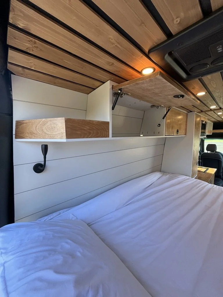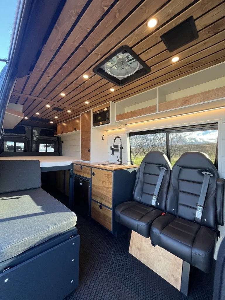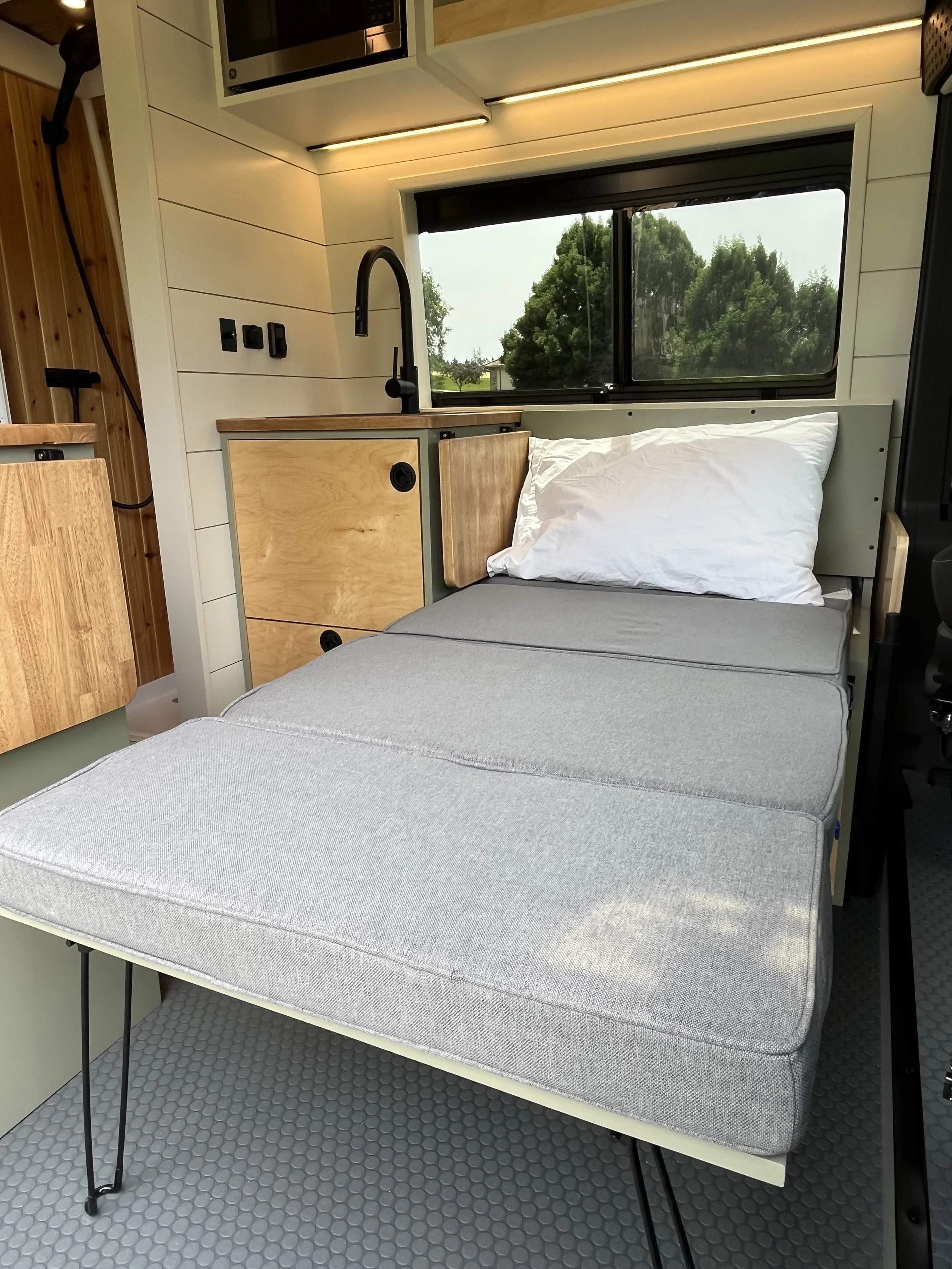 This custom van build was designed to accommodate families of four on whatever adventures come their way. With two side-mounted captain’s chairs for safe, comfortable travel, a large lofted queen bed, as well as two smaller bunk-style beds (Murphy bed and convertible bench-to-bed), this van design is perfect for families looking to get off-grid while maintaining all the comforts of home. This build boasts 600Ah of LiFePo4 batteries, a Victron Energy system, complete climate control (12V Velit AC, Velit gasoline heater and MaxxFan), a rear outdoor heated shower, ample storage, and open living areas.
