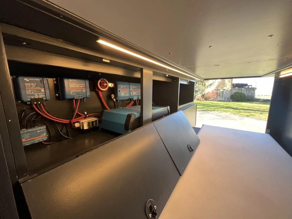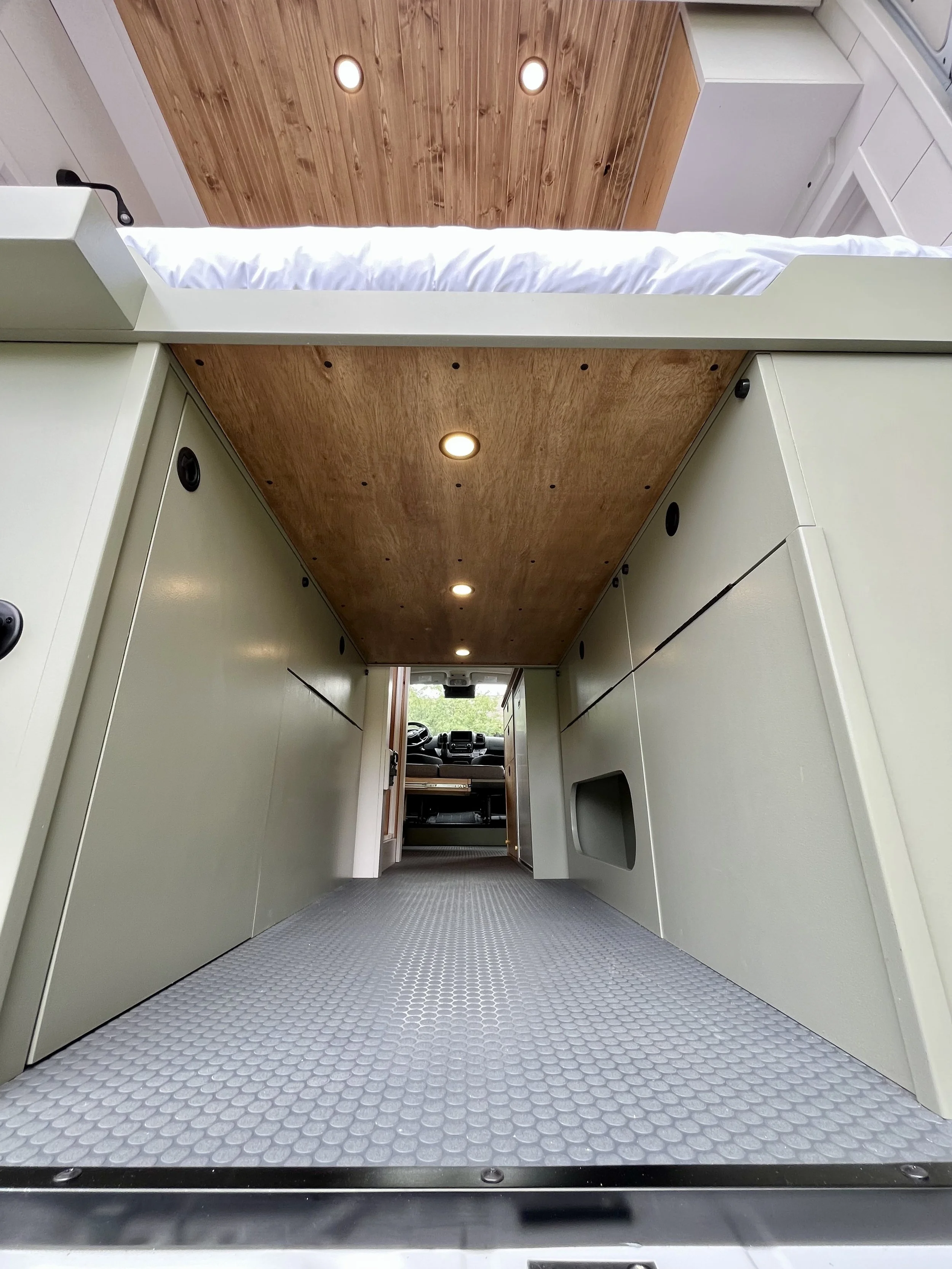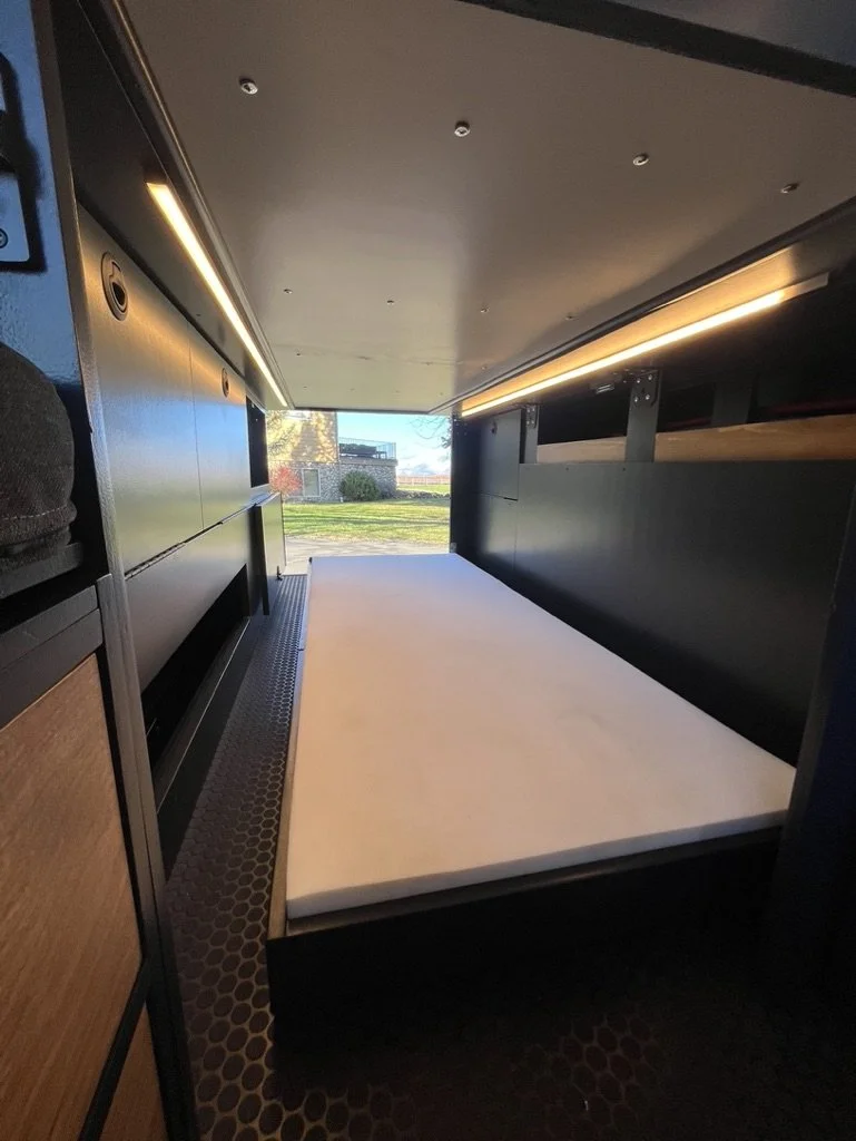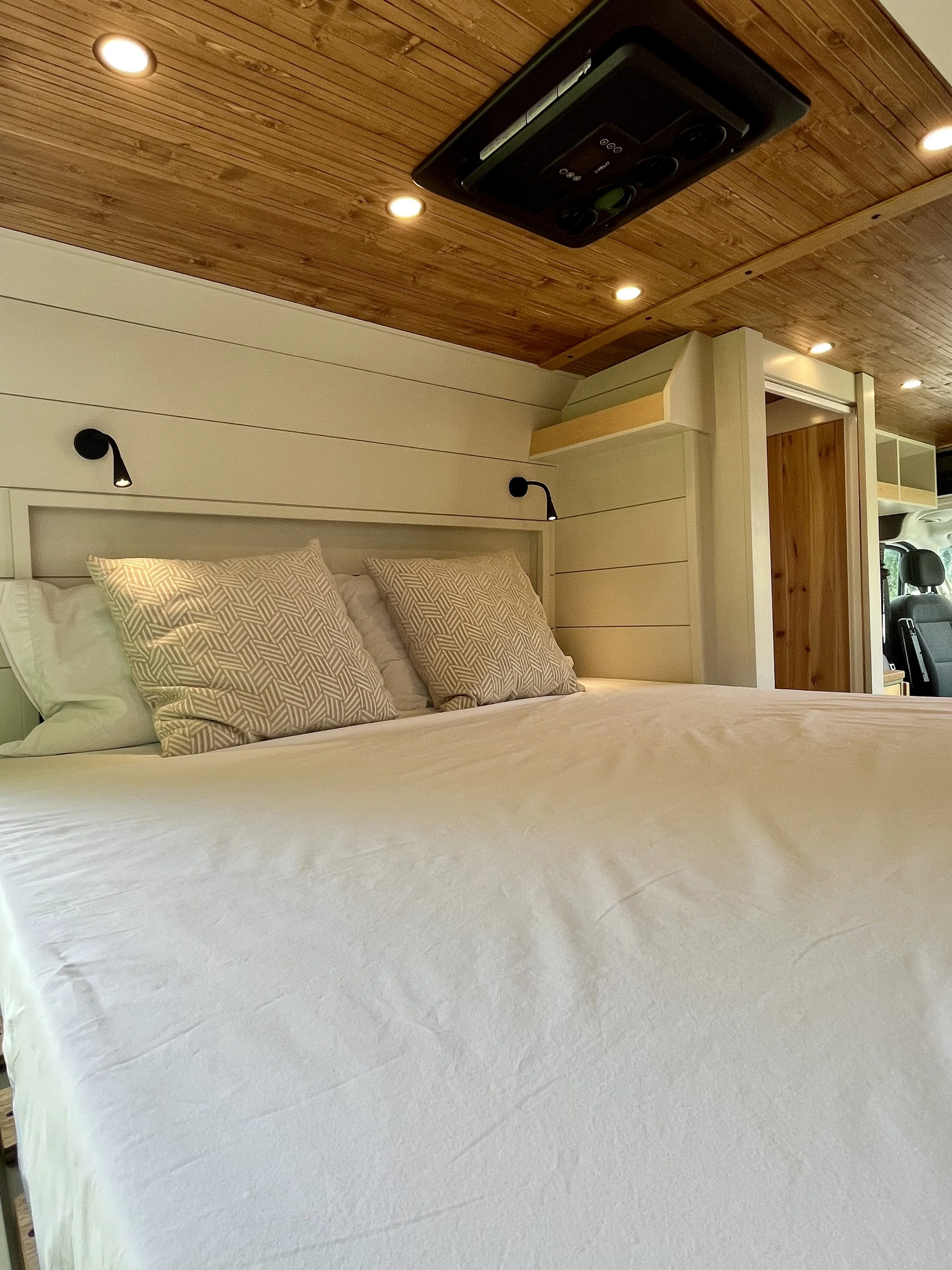 This custom van build was designed to accommodate families of four on whatever adventures come their way. With two side-mounted captain’s chairs for safe, comfortable travel, a large lofted queen bed, as well as two smaller bunk-style beds (Murphy bed and convertible bench-to-bed), this van design is perfect for families looking to get off-grid while maintaining all the comforts of home. This build boasts 600Ah of LiFePo4 batteries, a Victron Energy system, complete climate control (12V Velit AC, Velit gasoline heater and MaxxFan), a rear outdoor heated shower, ample storage, and open living areas.