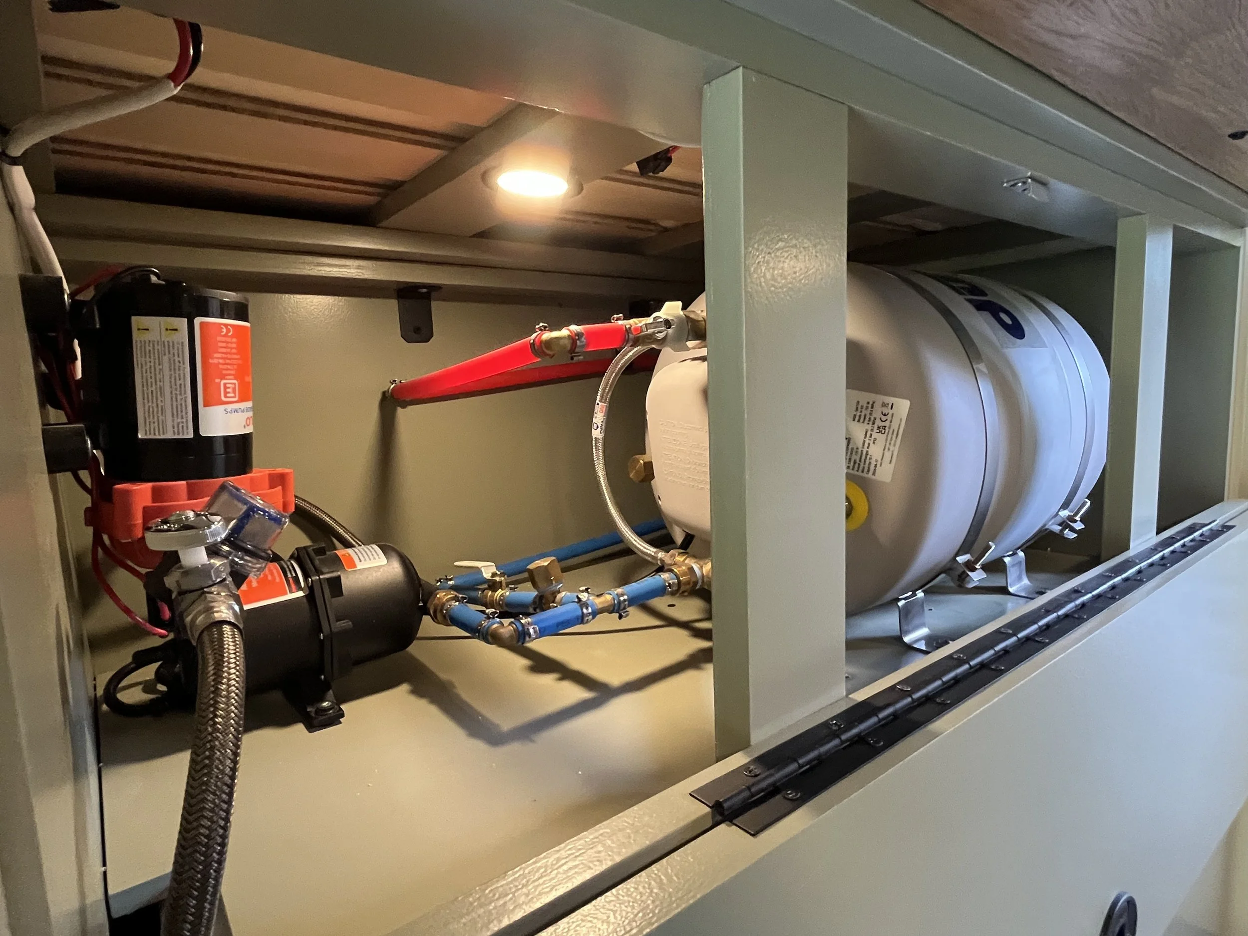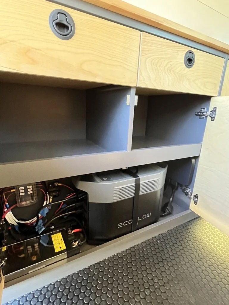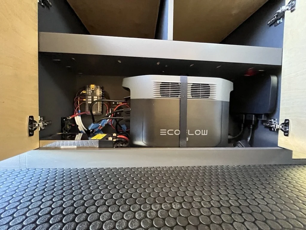 For this van design, our client, who owns and operates a boutique boarding house for dogs, was looking for a van layout that straddled the line between work and play. Most days, the van would be used for transporting pups on their various adventures, which meant flooring, cabinets, and walls would need to be tough, resilient, and easy to clean, and would also need additional seating in the rear. Alternatively, when not being used for work, the van includes a removable bed platform, a small 12V fridge, and an induction cooktop, all powered by an EcoFlow energy system.