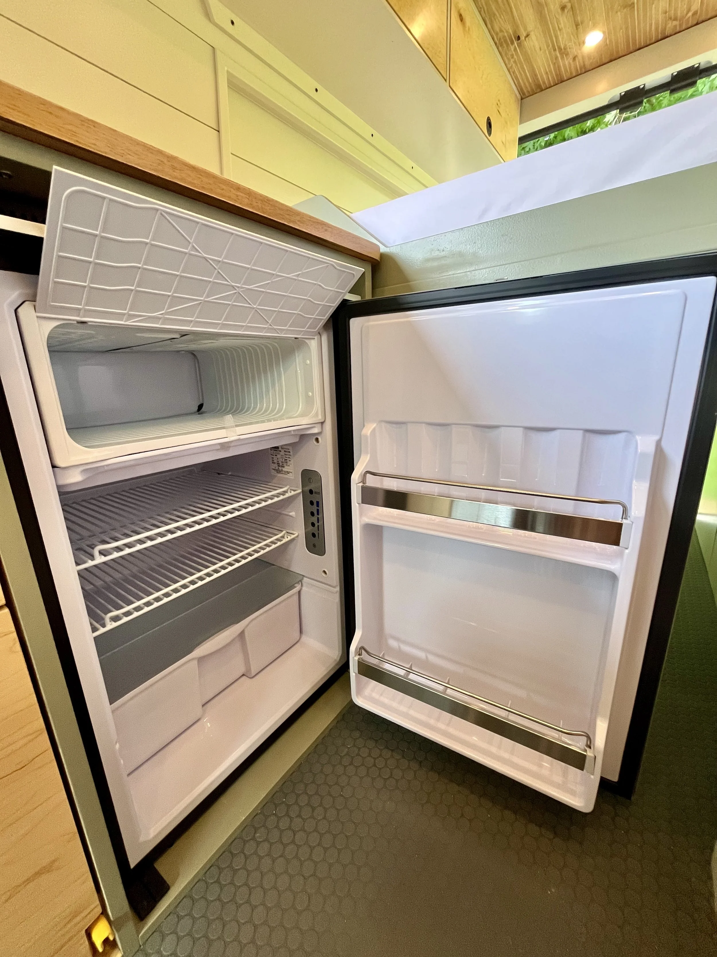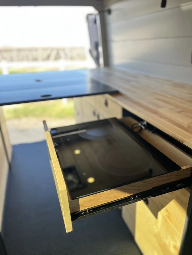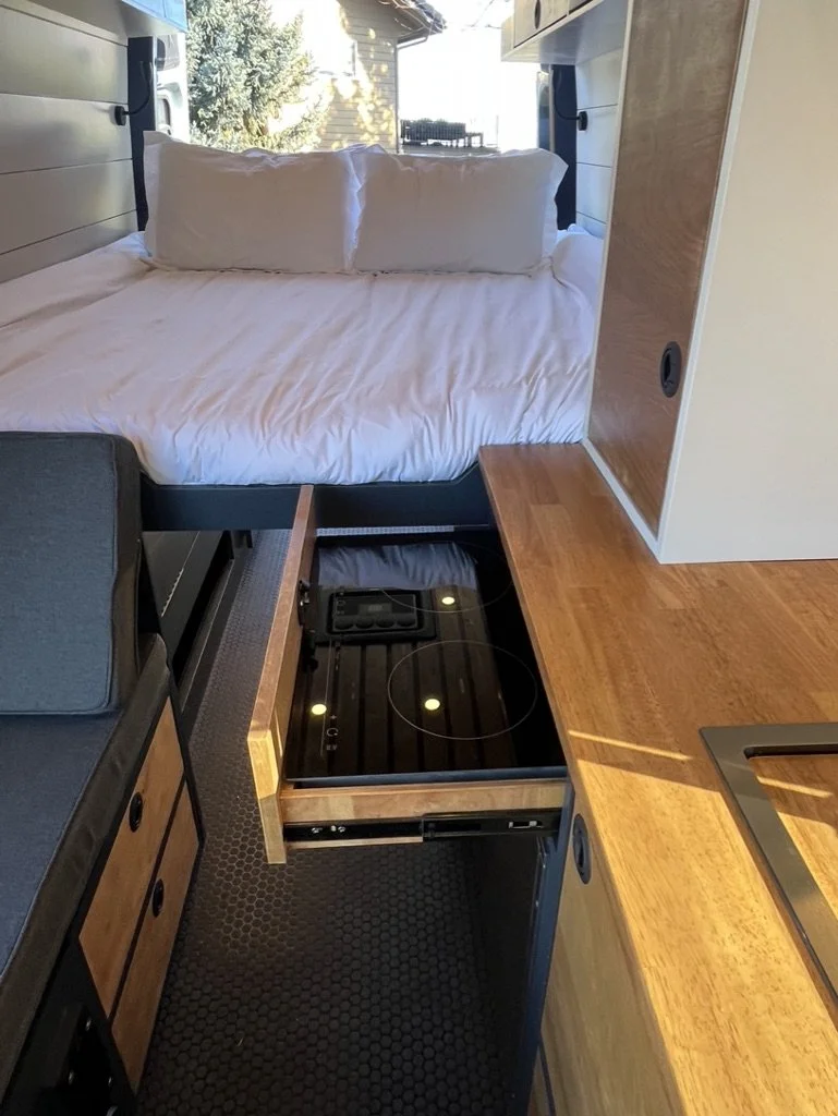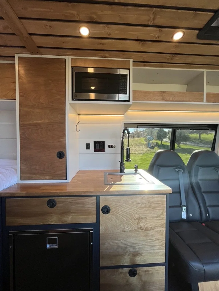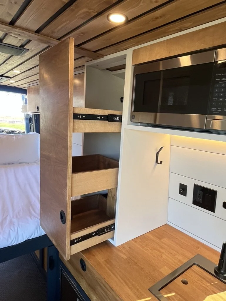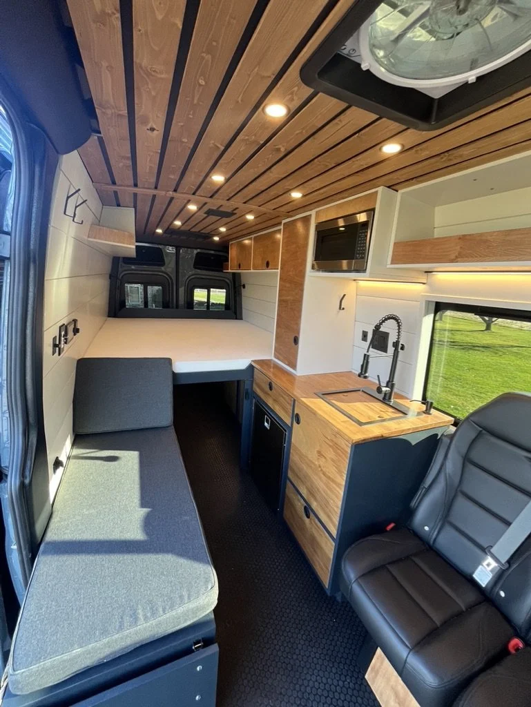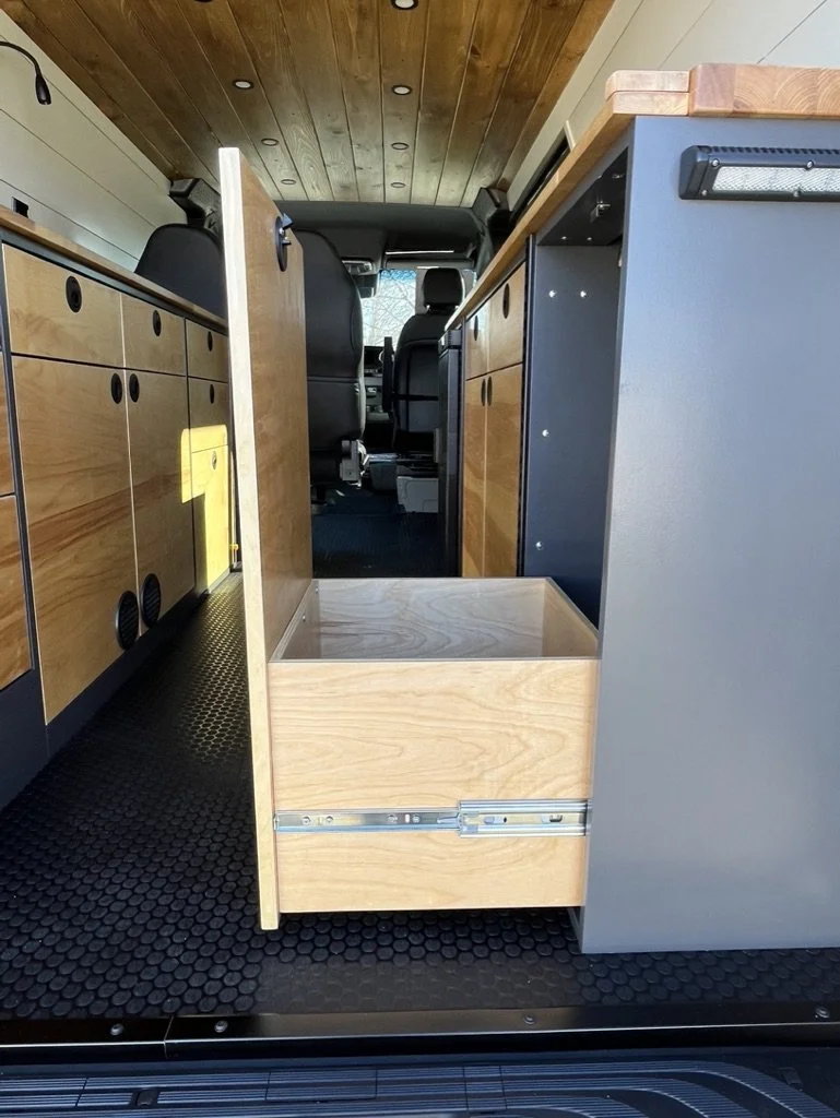 This custom build packs a lot into a small package. This Ford Transit 148” wheelbase high roof was converted to meet the needs of our client who would be living and working full-time out of the van along with her two dogs. Ensuring the van provided both functional workspace and comfortably appointed living areas meant every inch of the van needed to be utilized. The build features a hidden computer monitor, and adjustable table/desk setup as well as a kitchen with an induction stove, toaster/air fryer, cast iron sink, and high-end hardware and finishes throughout. Not to be forgotten, the van also features several dog-friendly additions, including a hidden dog gate, a pull-out ramp for getting in and out of the van as well as a built-in water and food bowl. This is all in addition to a robust 400ah electrical system with three-way charging including 375 watts of solar, 30-gallon fresh water and 17-gallon grey water tanks, and many more features.