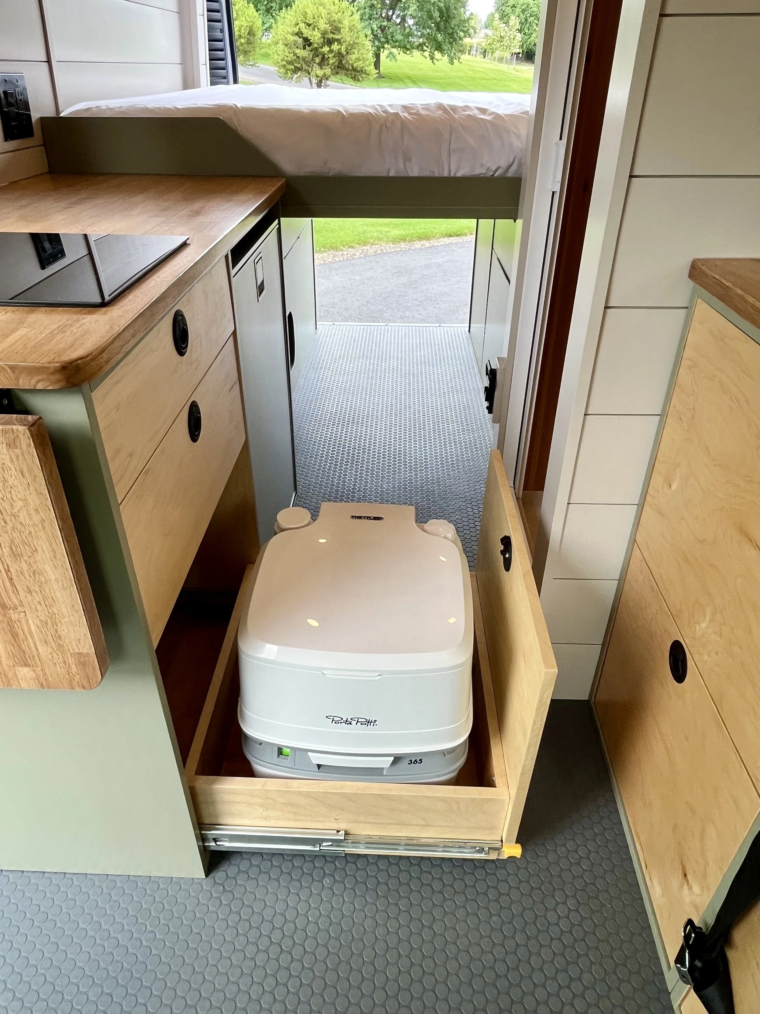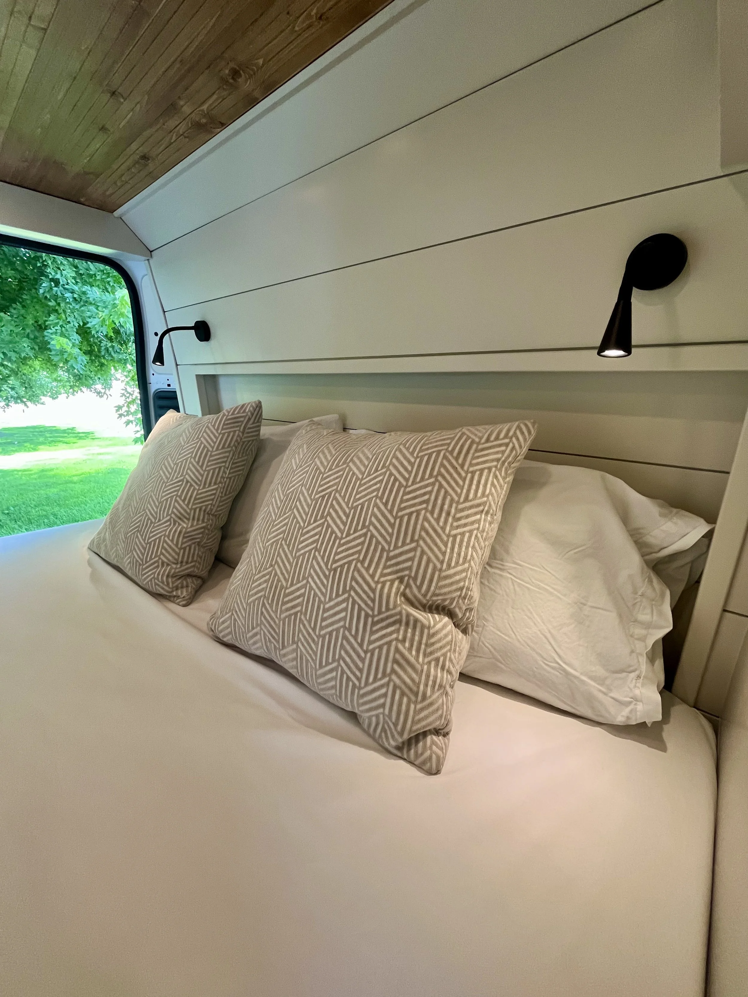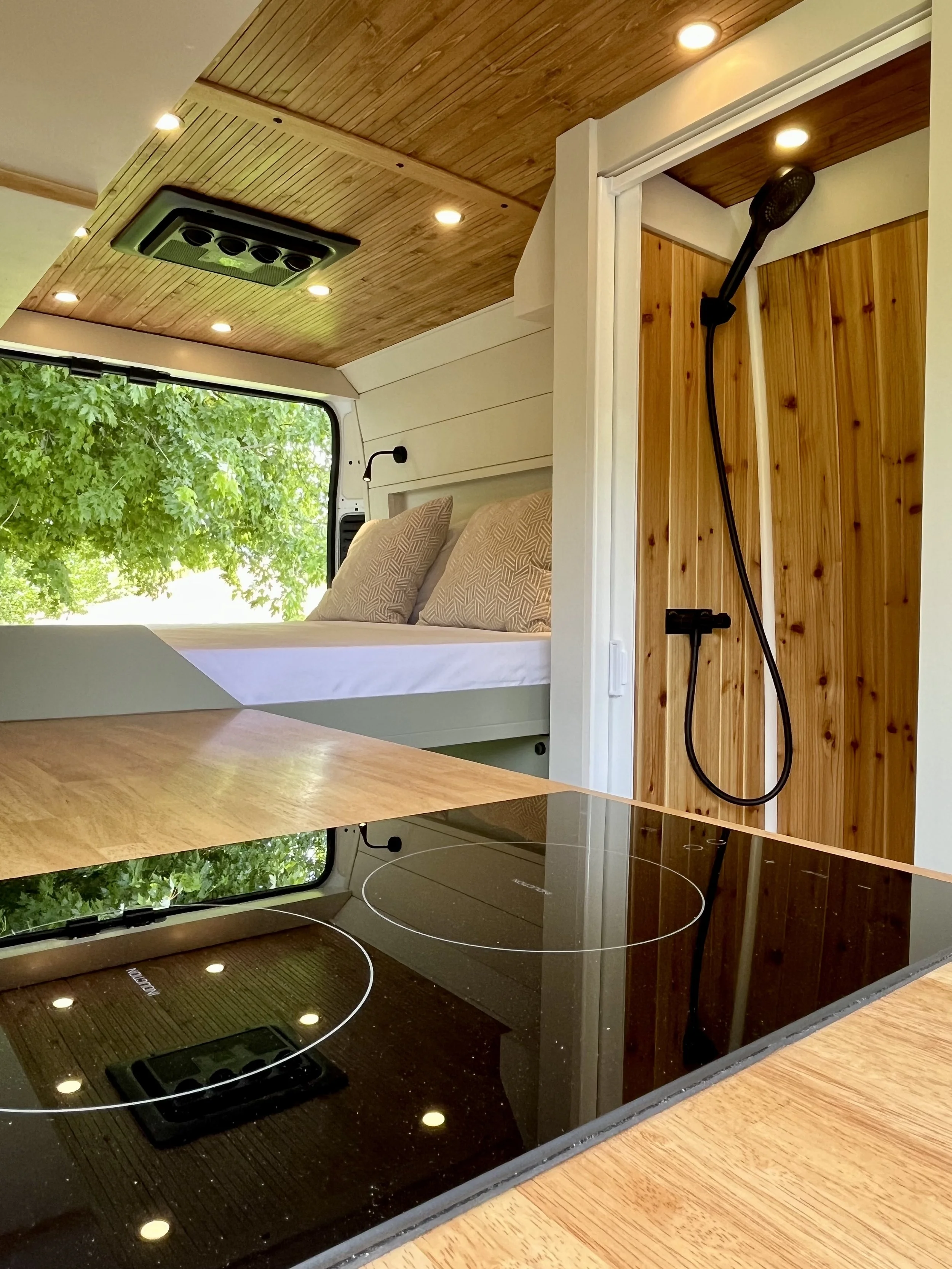 Cousin to one of our recent builds, Smokey, our newest build Lola has all the bells and whistles to make your next adventure more comfortable and cozy. This brand new 2022 Ram Promaster comes well-appointed from the factory, with the latest convenience and safety features. This van includes a powerful 400 amp-hour electrical system, ready to meet all your off-the-grid needs, a tiled shower, an induction stove tucked away in the custom-built cabinets, a pull-out toilet, and an efficient marine refrigerator, built-in Bluetooth sound system and a Webasto air heater to keep you toasty when nights turn cold. As in all Nothing Ventured builds, function, and form go hand-in-hand, with great attention paid to how the van performs and presents.