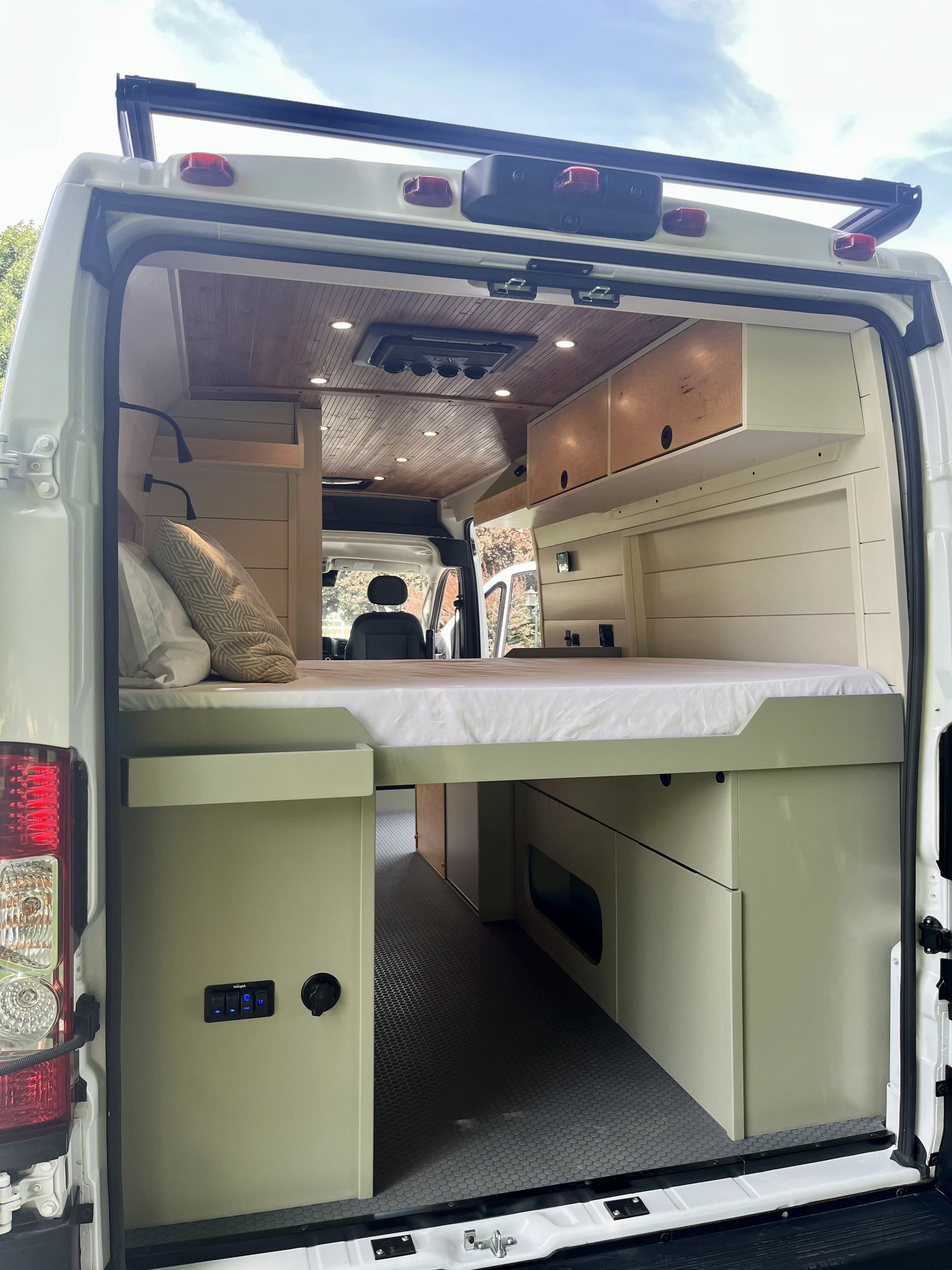 The idea behind our newest van concept was to create a jack-of-all-trades van conversion - a Goldilocks if you will. This design strikes a purposeful balance to meet the needs of your next adventure. Featuring a robust electrical system, custom, locking cabinets, ample seating and storage, an outdoor shower, and a full kitchen set up with a fridge, sink, and stove, this van is designed to meet and exceed the needs of your next road trip. This design can also be upgraded to meet specific client requests or requirements, including scalable battery and solar power setups, a rooftop deck, awning, etc.