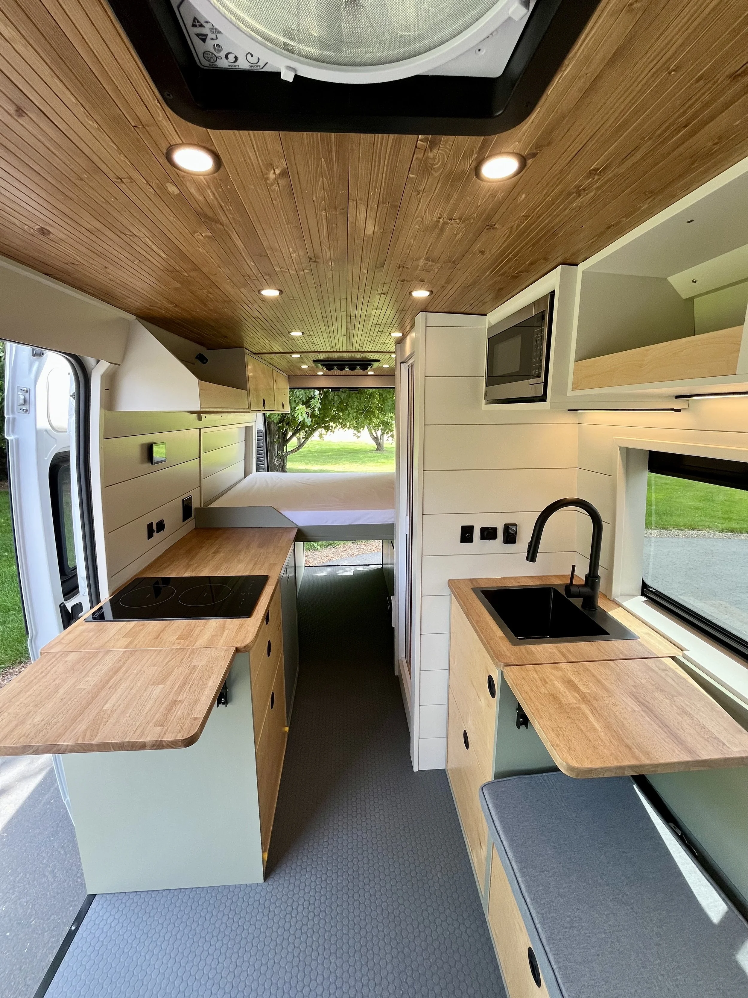 A redesign of an existing build, Farley is a Ram Promster 3500 ext. The idea behind Farley’s layout was to create a dynamic design, which allowed for multiple seating areas, giving this van an open and specious feel. Drawing from modern design, Farely combines all the amenities, appliances, and capabilities of a serious off-grid vehicle within the refined finishes of home. Featuring a queen-sized, convertible dinette bed, hot water, shower, toilet, refrigerator, induction stove, cedar rooftop deck, Bluetooth speakers, and WIFI, Farley is the perfect home base, whether you're off-grid boondocking or plugged in at a campground. Utilizing a powerful 400-amp hour, LiFePo4 battery bank, 400 watts of solar, 3000-watt inverter charger, and powerful 60 amp DC-DC charging while you drive, Farley is designed to power the entire van, without plugging into shore power.